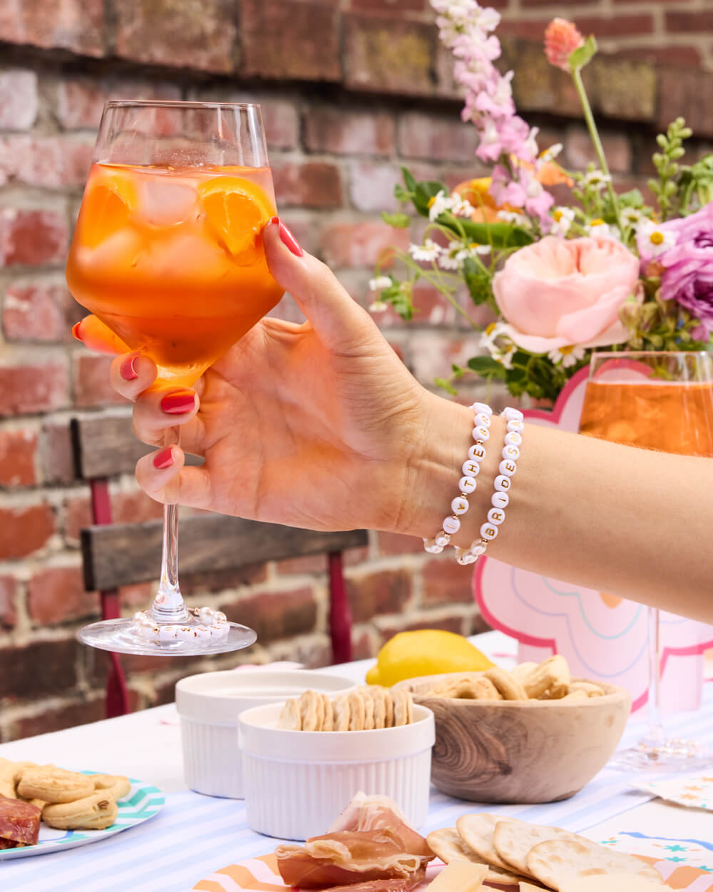 Faux pearls and letter beads threaded on elastic