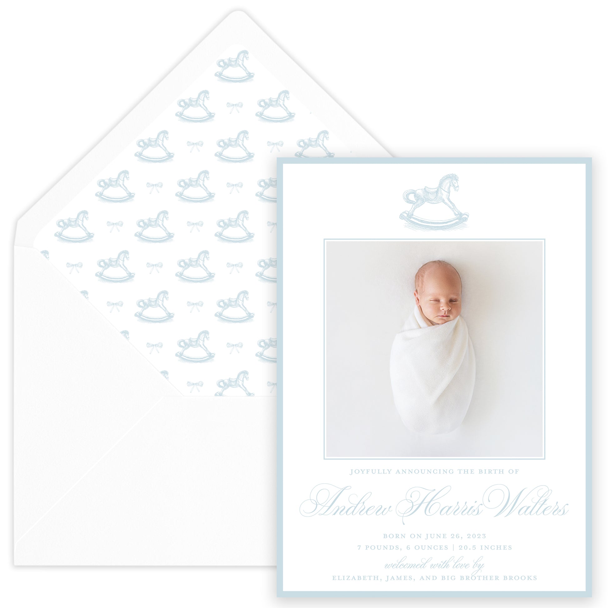 blue rocking horse birth announcement