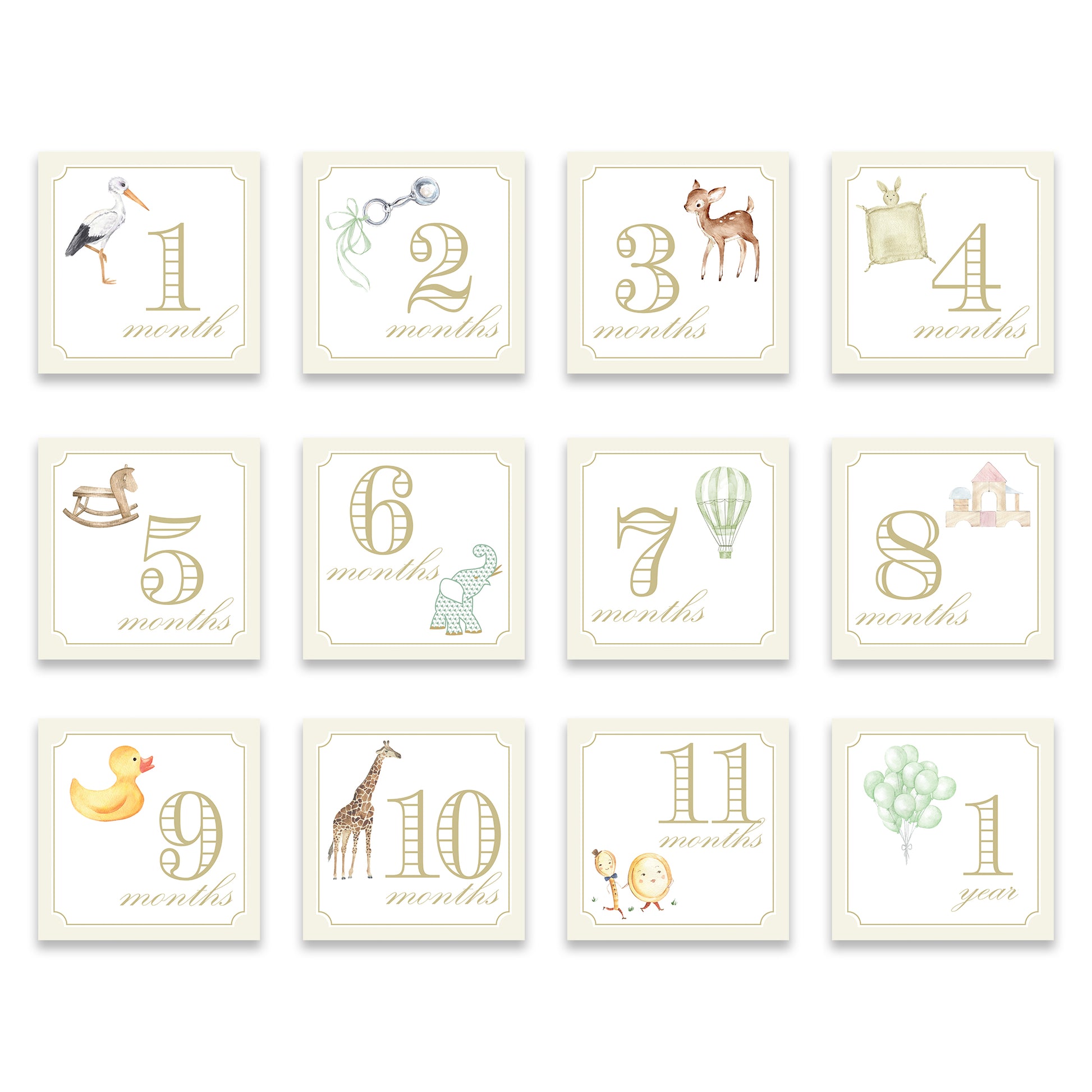capture adorable monthly photos of your little one with these classic milestone cards or just use them as keepsakes! the front of each card features an illustration and the featured month, while the back contains a space to jot down milestones or memories from each month.