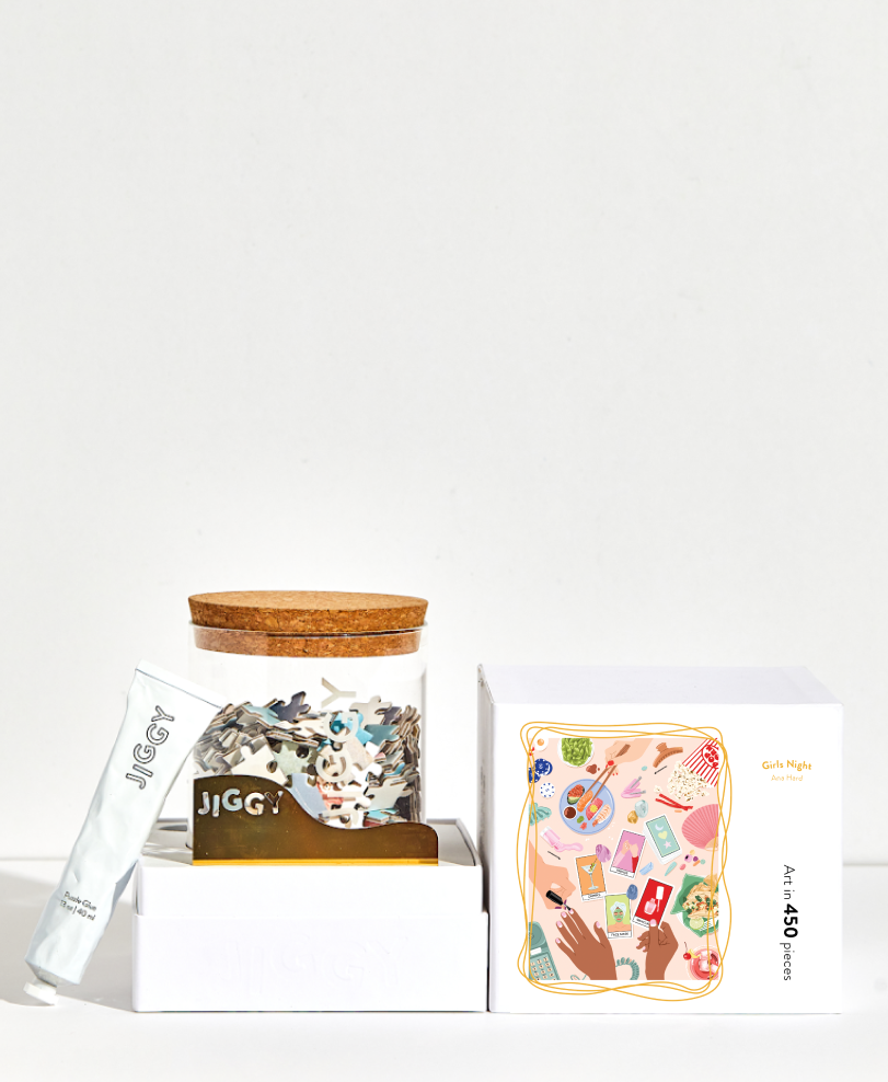 Each JIGGY puzzle comes in a reusable glass jar and includes a tube of puzzle glue, a straight-edge tool to spread the glue and a print of the art to follow.