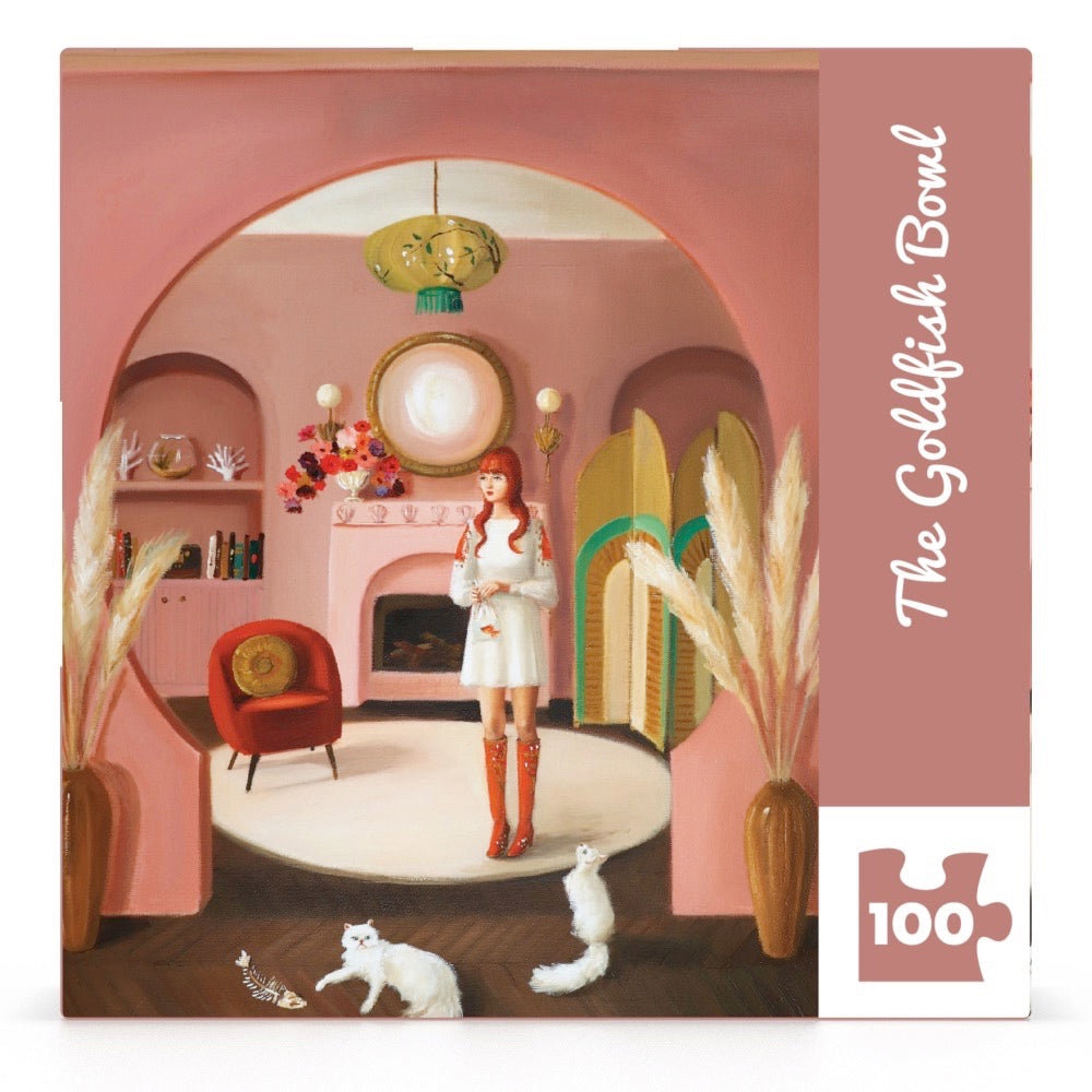 A pair of mischievous cats awaits their next meal from the goldfish bowl.