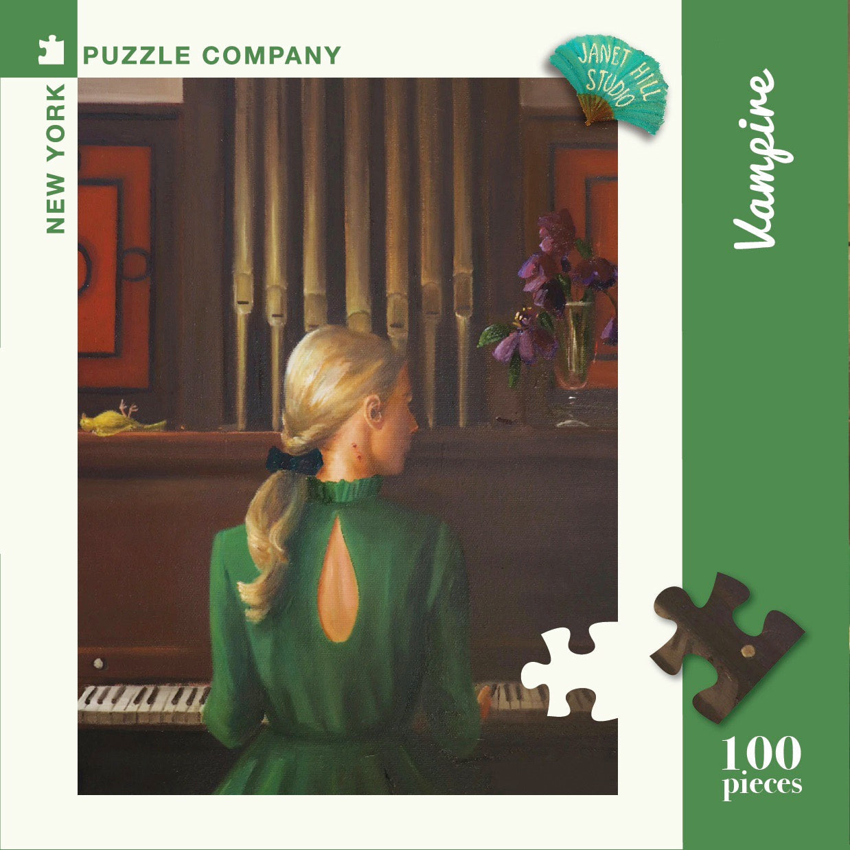 Vampire fangs adorn the neck of a mysterious woman playing the piano.